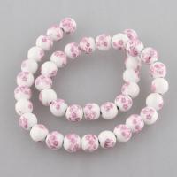 Фарфоровая бусина (porcelain) с принтом в виде сиренево-розовых цветочков, оттенок может отличаться от фотографии. Рисунок может быть немного смазан (см. фото). Диаметр бусин - около 8 мм, диаметр отверстия - около 1.8 мм. Бусины могут немного отличаться по форме и размеру. Цена за низку, около 42 бусин.
