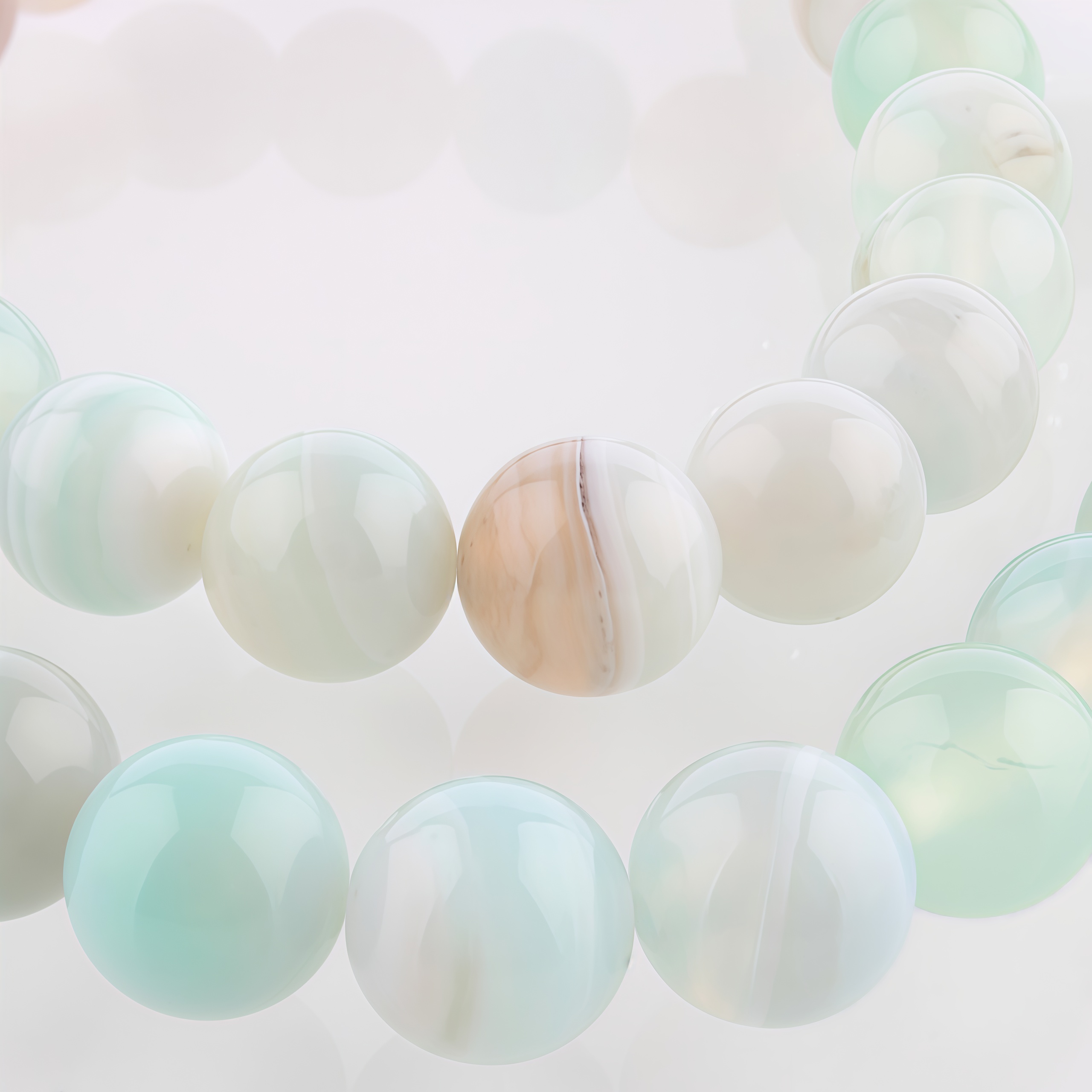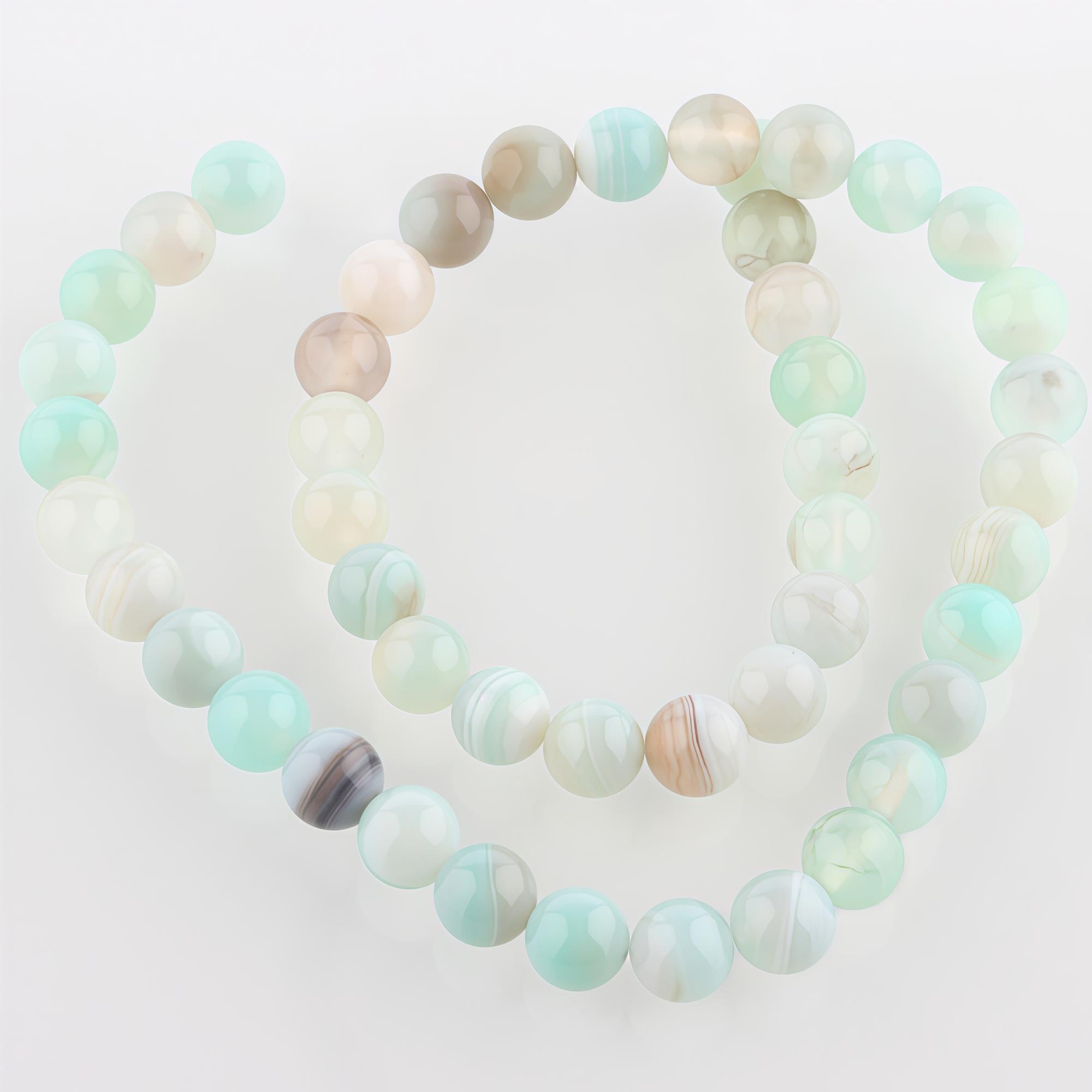 Каменные бусины - шарики из натурального тонированного полосатого агата. Часть бусин полосатая, часть однотонная. Оттенок может немного отличаться от представленного на фотографии, могут попадаться зеленые, голубые, серые, белые и кремовые бусины. Размер бусин может немного отличаться от заявленного производителем. Цена за низку длиной примерно 37-38 см, около 46 бусин. Низки формируются производителем без проверки на дефекты каждой бусины и без подбора по цвету.