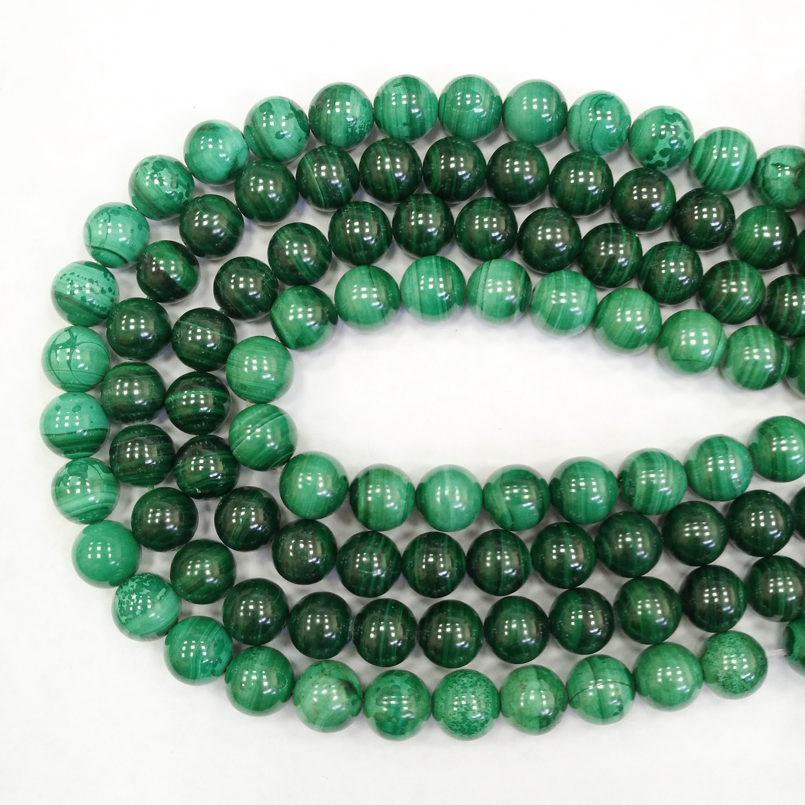 Круглые каменные бусины из натурального заирского малахита. Могут попадаться бусины с небольшими щербинками. Бусины могут немного отличаться по форме, размеру и оттенку. В низке около 10 бусин. Цена за низку.