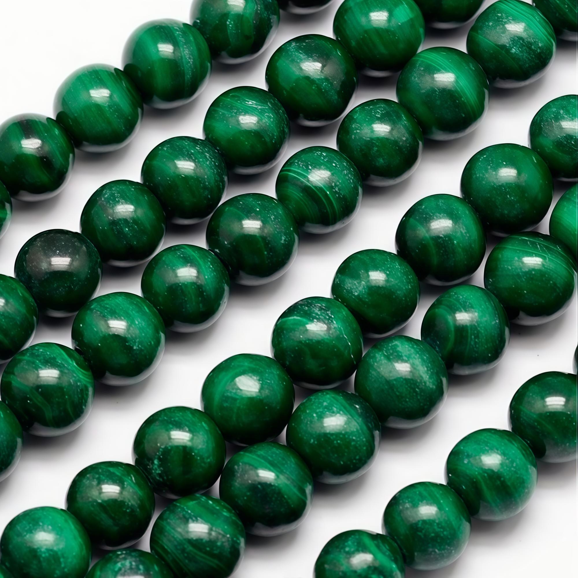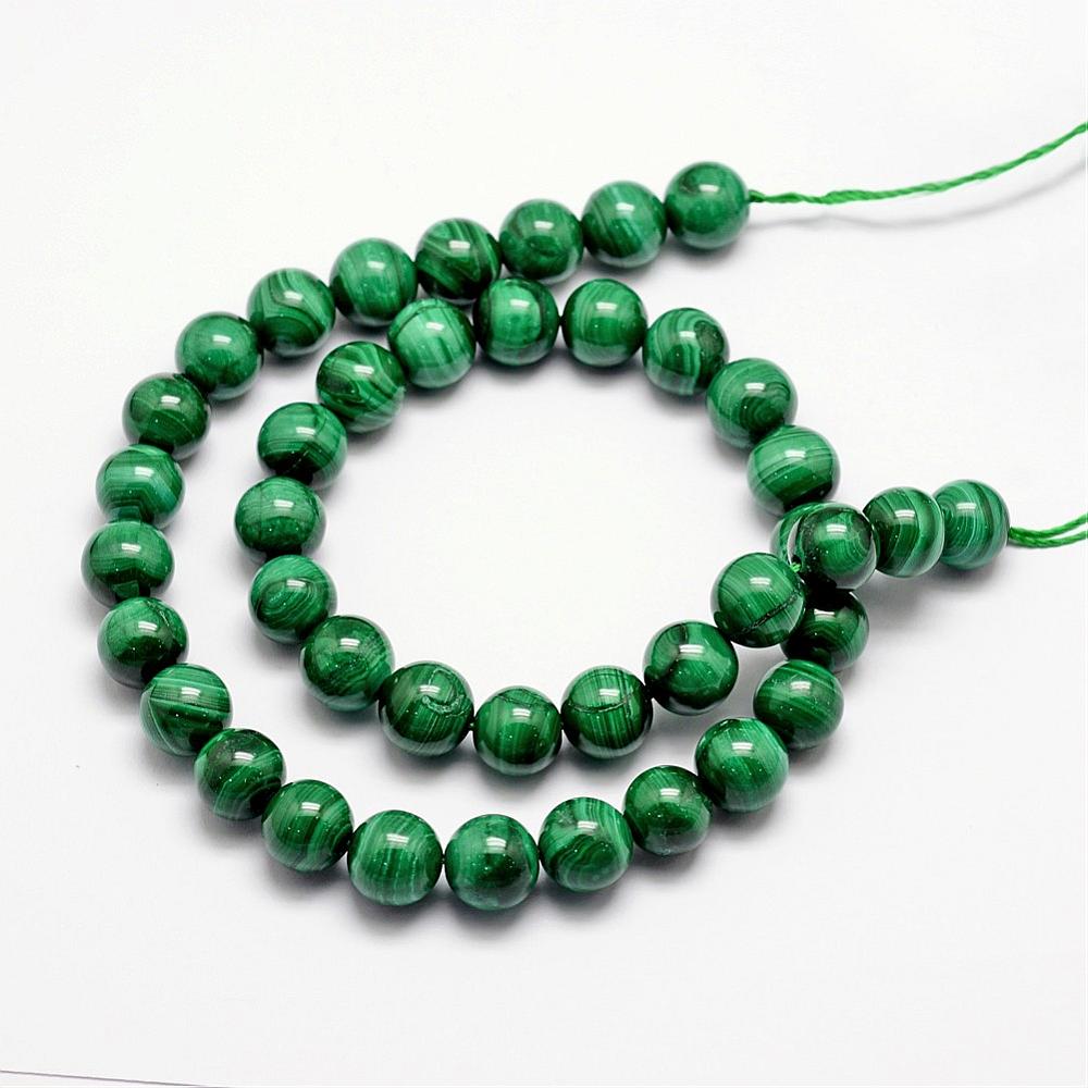 Бусины - гладкие шарики из натурального камня - заирского малахита. Могут попадаться бусины с небольшими щербинками. Бусины могут немного отличаться по размеру, форме и оттенку. Внутри бусин может быть каменная пыль от сверления, которая может красить нить и кожу в зеленый цвет. Рекомендуется промывать бусины перед использованием. В низке около 10 бусин. Цена за низку.