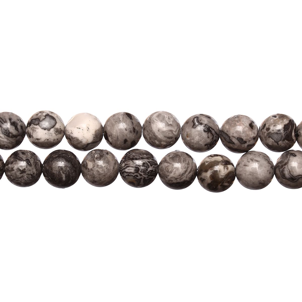 Гладкие круглые каменные бусины из натуральной пейзажной яшмы в серых тонах. Цвет и рисунок на бусинах может отличаться от фотографии. Бусины могут немного отличаться по форме и размеру. Длина низки около 38 см, в низке примерно 44 бусин (низки формируются без проверки на дефекты каждой бусины и без подбора бусин по рисунку). Цена за низку.