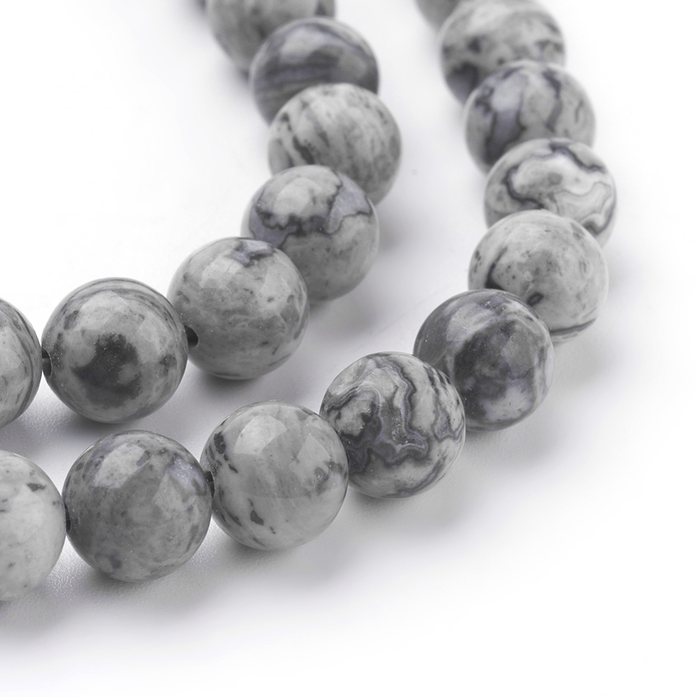 Гладкие бусины-шарики из натурального камня - пейзажной яшмы в серых тонах. Цвет и рисунок на бусинах может отличаться от фотографии. Бусины могут немного отличаться по форме и размеру. Длина низки около 38 см, в низке примерно 44 бусин (низки формируются без проверки на дефекты каждой бусины и без подбора бусин по рисунку). Цена за низку.