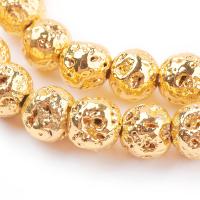 Круглые каменные бусины из натуральной вулканической лавы (вулканического туфа), с гальваническим металлическим покрытием золотистого цвета. Оттенок может отличаться от фотографии. Бусины могут немного отличаться по форме и размеру. Цена за низку 37 см (около 45 бусин, низки формируются без проверки каждой бусины на дефекты).