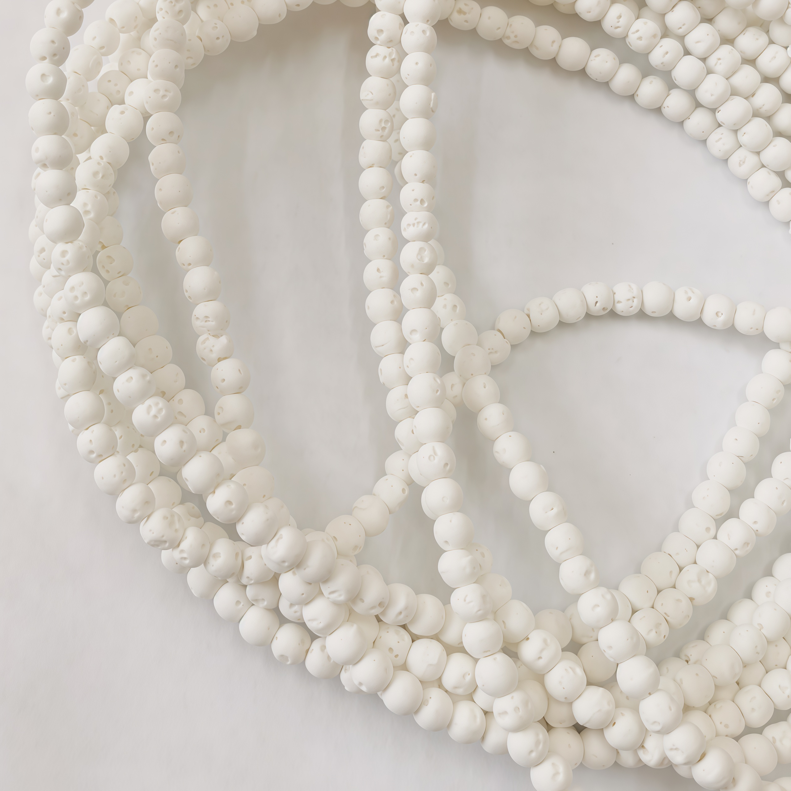 Бусины из измельчённой и спрессованной вулканической лавы (вулканического туфа), тонированной в белый цвет. На бусинах может быть виден шов, возможны неровности на поверхности. Оттенок может отличаться от фотографии и в разных поставках. Диаметр отверстия около 1 мм. Могут немного отличаться по форме и размеру. Бусины покрыты белой пылью от сверления, рекомендуется их протереть или промыть их перед использованием. Цена за низку, около 96 бусин. Низки формируются без проверки каждой бусины на дефекты.