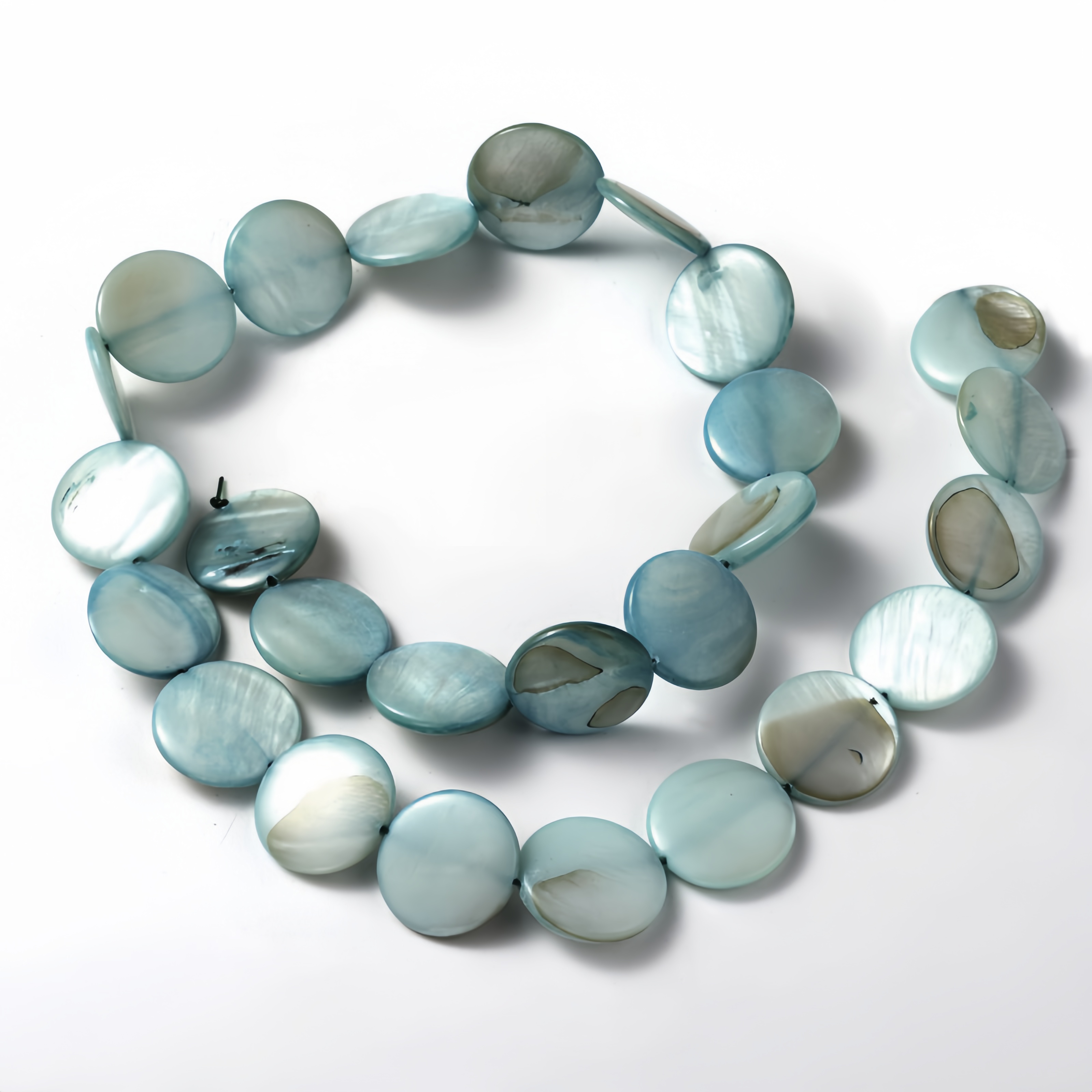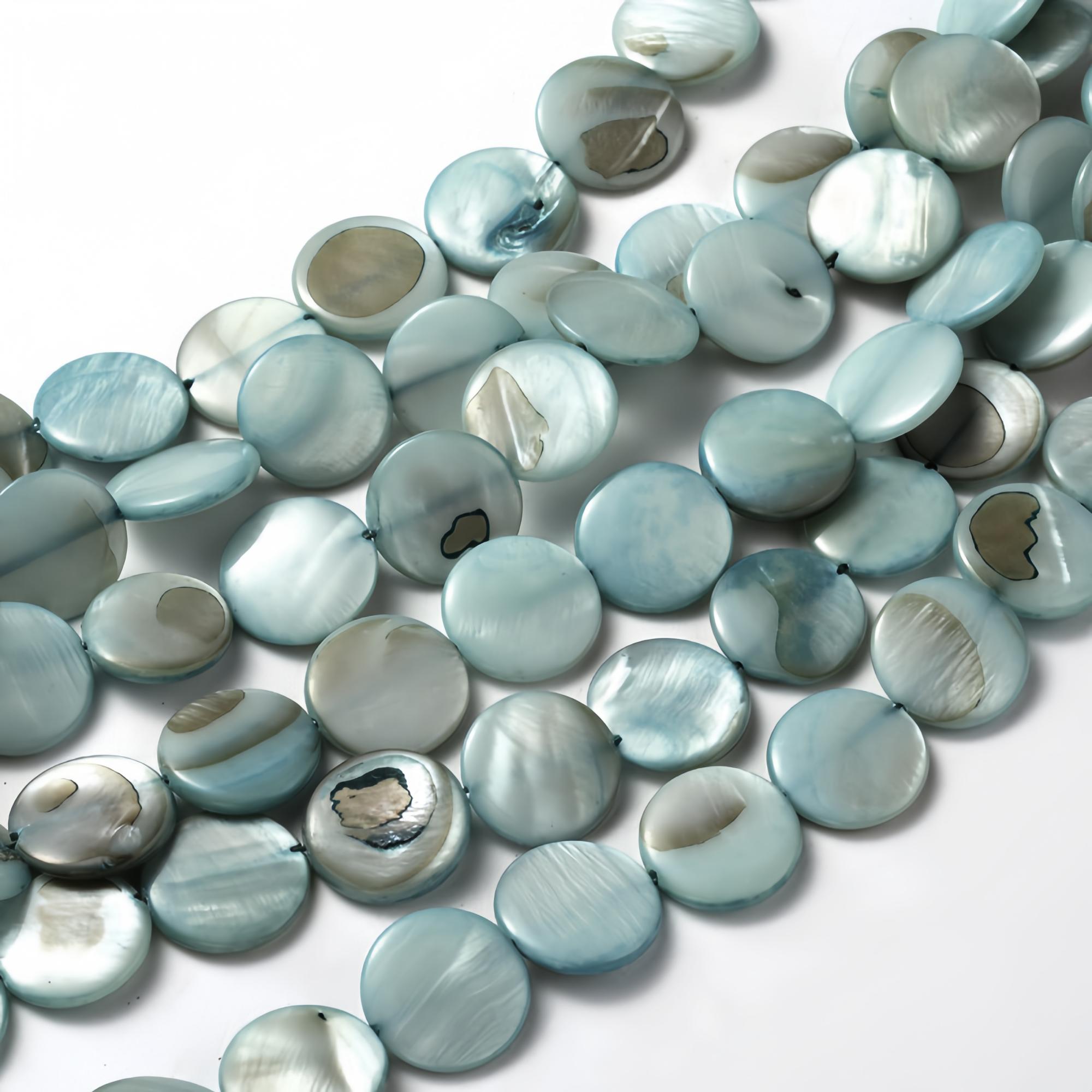 Круглые бусины-пластинки из натурального тонированного перламутра зеленовато-сине-голубого цвета. На бусинах есть темные пятна, возможны щербинки естественного происхождения. Бусины могут немного отличаться по форме и размеру. Оттенок может отличаться от фотографии и от партии к партии. Цена за 1 низку длиной около 36 см (примерно 25 бусин, низки формируются без проверки каждой бусины на дефекты).