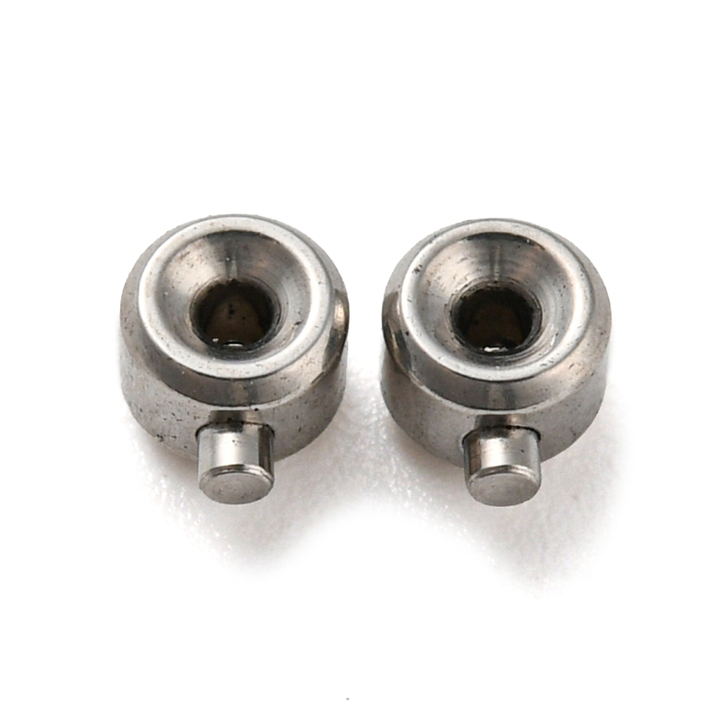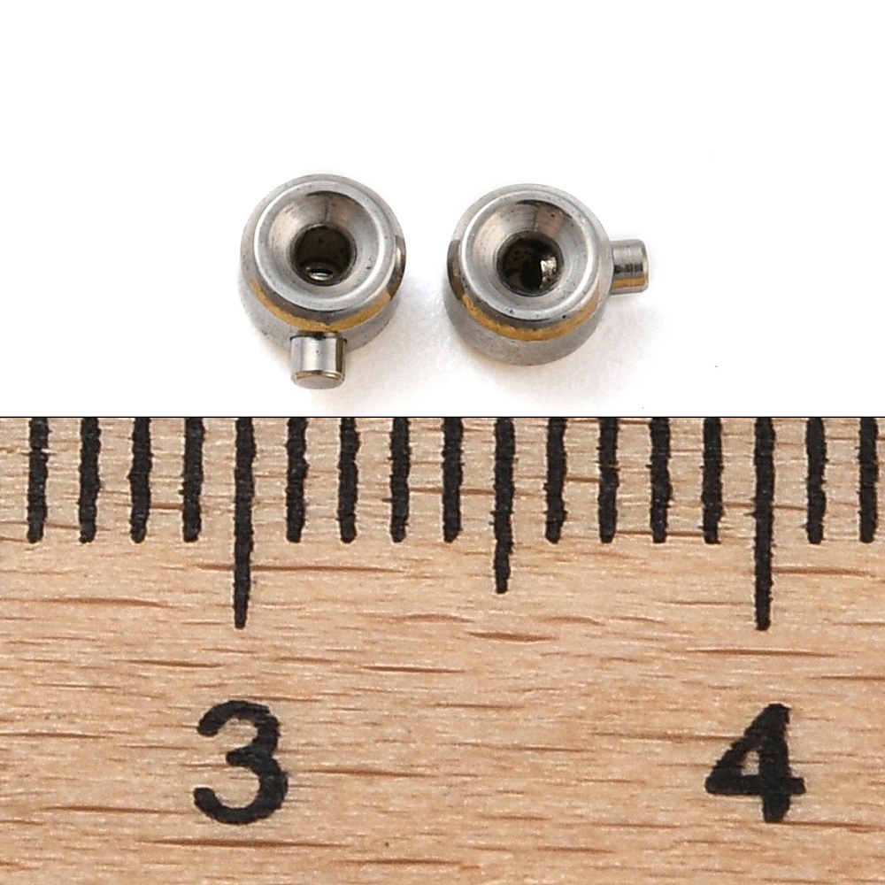 Не темнеющая фурнитура для бижутерии из нержавеющей стали (марка 303, не окисляется, не облезает). Защёлкивающийся кримп One Touch ("Одно Прикосновение") - цилиндрическая бусина с зажимающимся внутрь штырьком (кнопочкой). Диаметр цилиндра около 3.2мм (без учёта штырька), высота около 2.3мм. Используется для фиксации ювелирного тросика, лески или проволоки. С таким кримпом не нужно использовать покрывнную бусину, т.к. он сам по себе смотрится очень аккуратно и профессионально. Вставив тросик (леску,проволоку) в кримп, просто нажмите на торчащий штырёк и он надёжно зафиксирует тросик внутри кримпа. Обратите внимание: кримпы зажимаются довольно туго; при зажимании штырёк входит в кримп не до конца (на поверхности остаётся небольшой кончик). Кримп предназначен для однократного использования! Внутренний диаметр около 0.7 мм. Оттенок может отличаться от фотографии и в разных поставках. Цена за 5 шт.