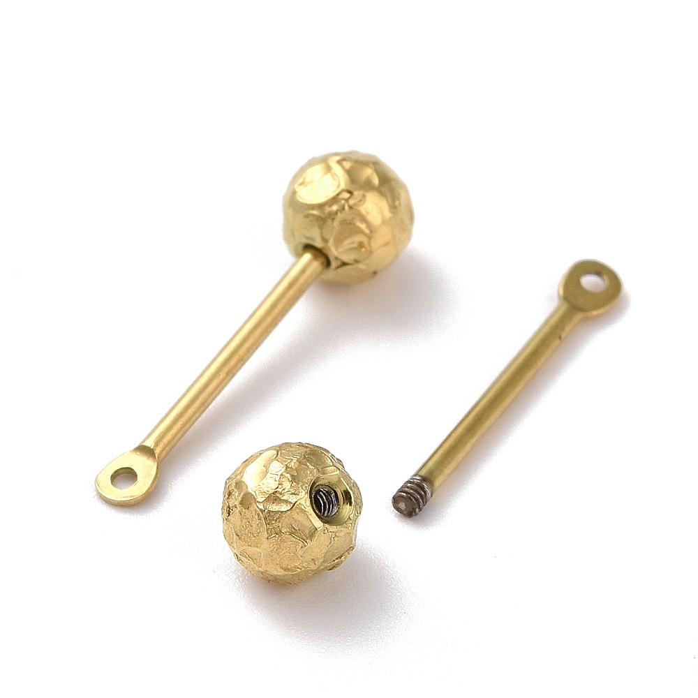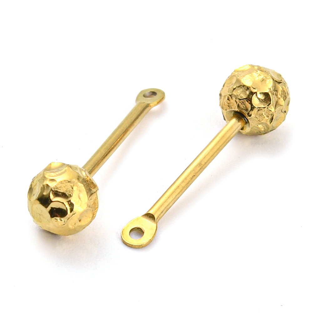 Основа - штанга для лэмпворка с текстурированным шариком и петелькой. Шарик скручивается. На штифт можно надевать различные бусины, меняя их так часто, как захотите. Расстояние между петелькой и шариком 10-12 мм. Диаметр шарика - 5 мм. Диаметр штифта - 1.1 мм. Диаметр петельки - 2.3 мм. Общая длина - 19 мм. Размеры могут немного отличаться от заявленных. Базовый материал - нержавеющая сталь марок 304 (штифт) и 316 (бусина), сверху покрытие под золото. Оттенок может отличаться от фотографии и в разных поставках. Эти подвески-основы отлично подходят для создания серег, кулонов, брелоков. Цена за 2 шт.