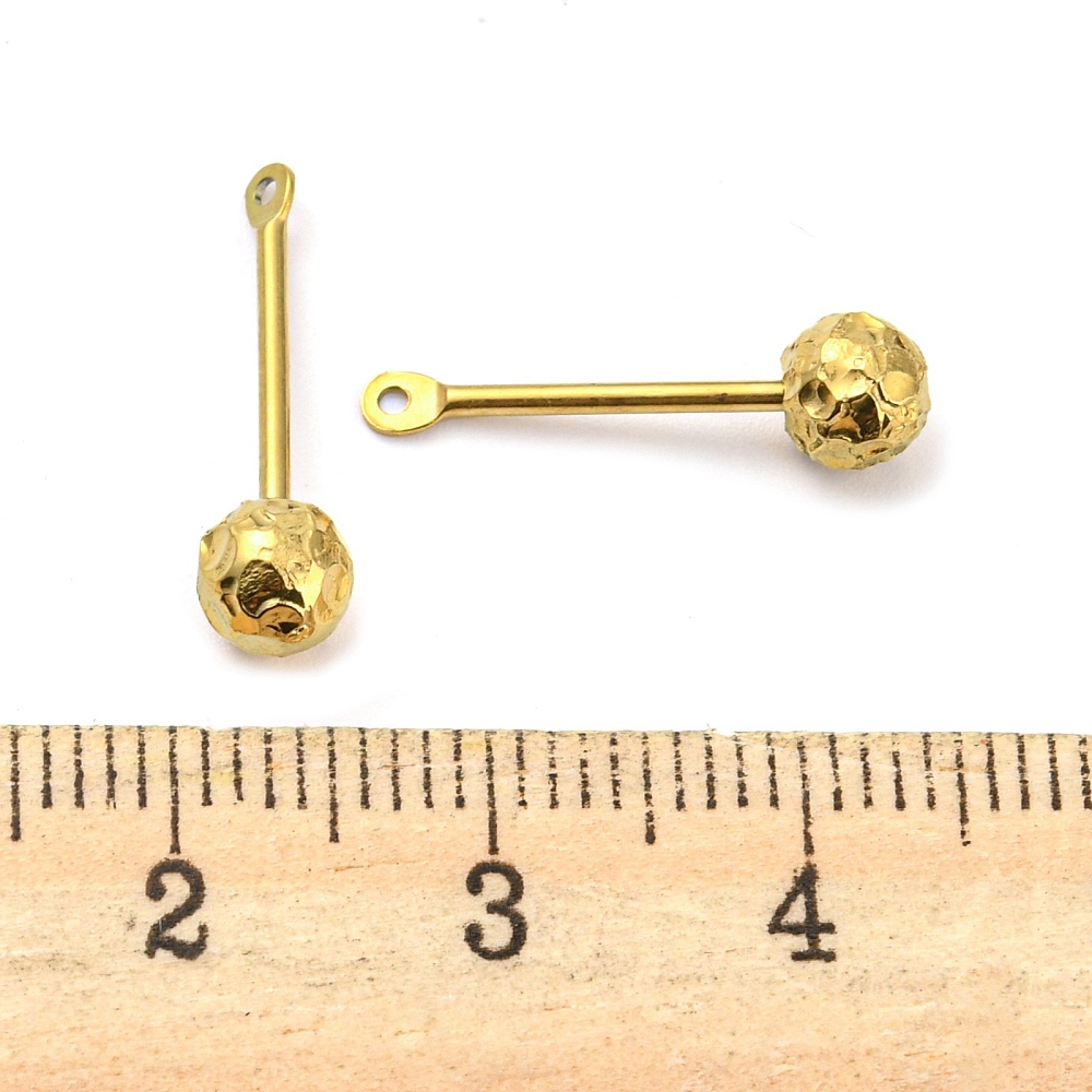 Основа - штанга для лэмпворка с фактурным шариком и петелькой. Шарик скручивается, по текстуре напоминает смятую фольгу или метеорит. На штифт можно надевать различные бусины, меняя их так часто, как захотите. Расстояние между петелькой и шариком 10-12 мм. Диаметр шарика - 5 мм. Диаметр штифта - 1.1 мм. Диаметр петельки - 2.3 мм. Общая длина - 19 мм. Размеры могут немного отличаться от заявленных. Базовый материал - нержавеющая сталь марок 304 (штифт) и 316 (бусина), сверху покрытие под золото. Оттенок может отличаться от фотографии и в разных поставках. Эти подвески-основы отлично подходят для создания серег, кулонов, брелоков. Цена за 2 шт.