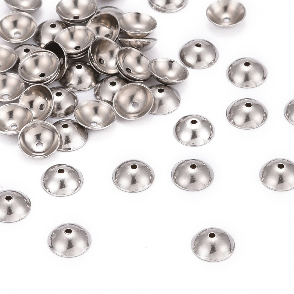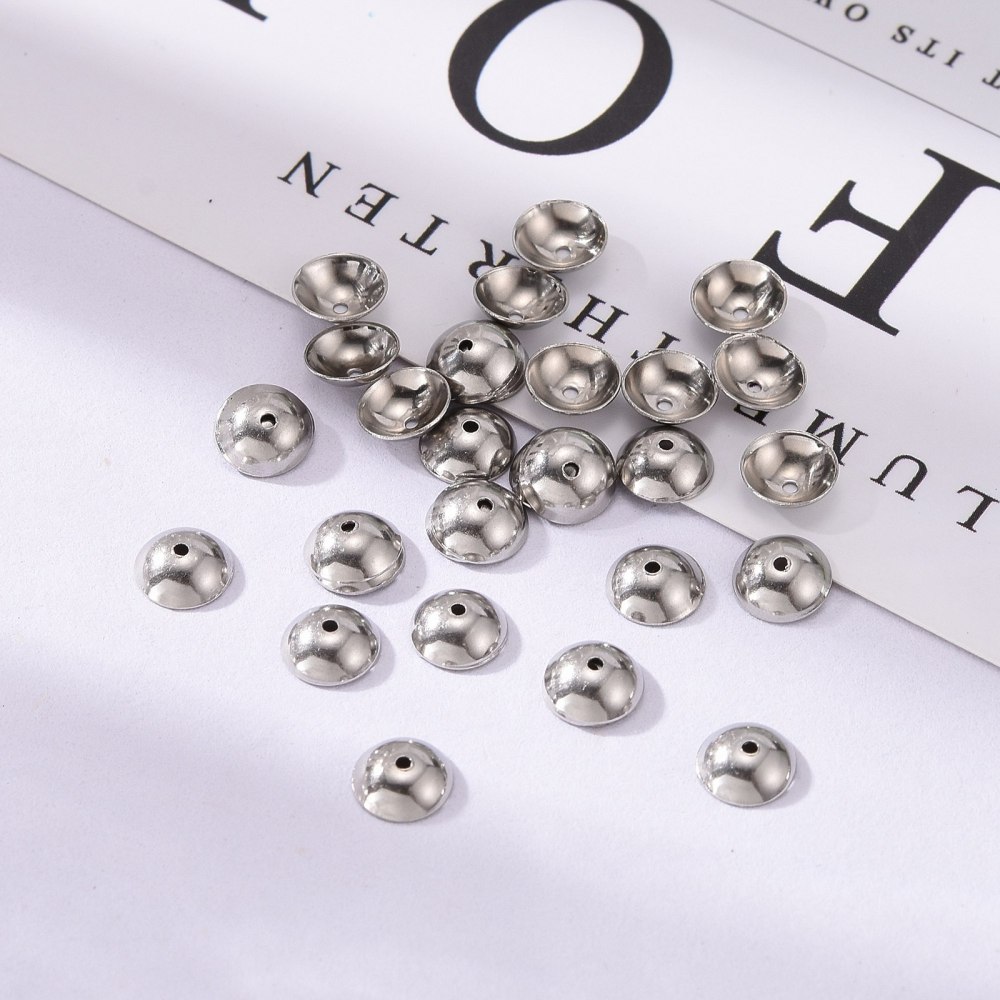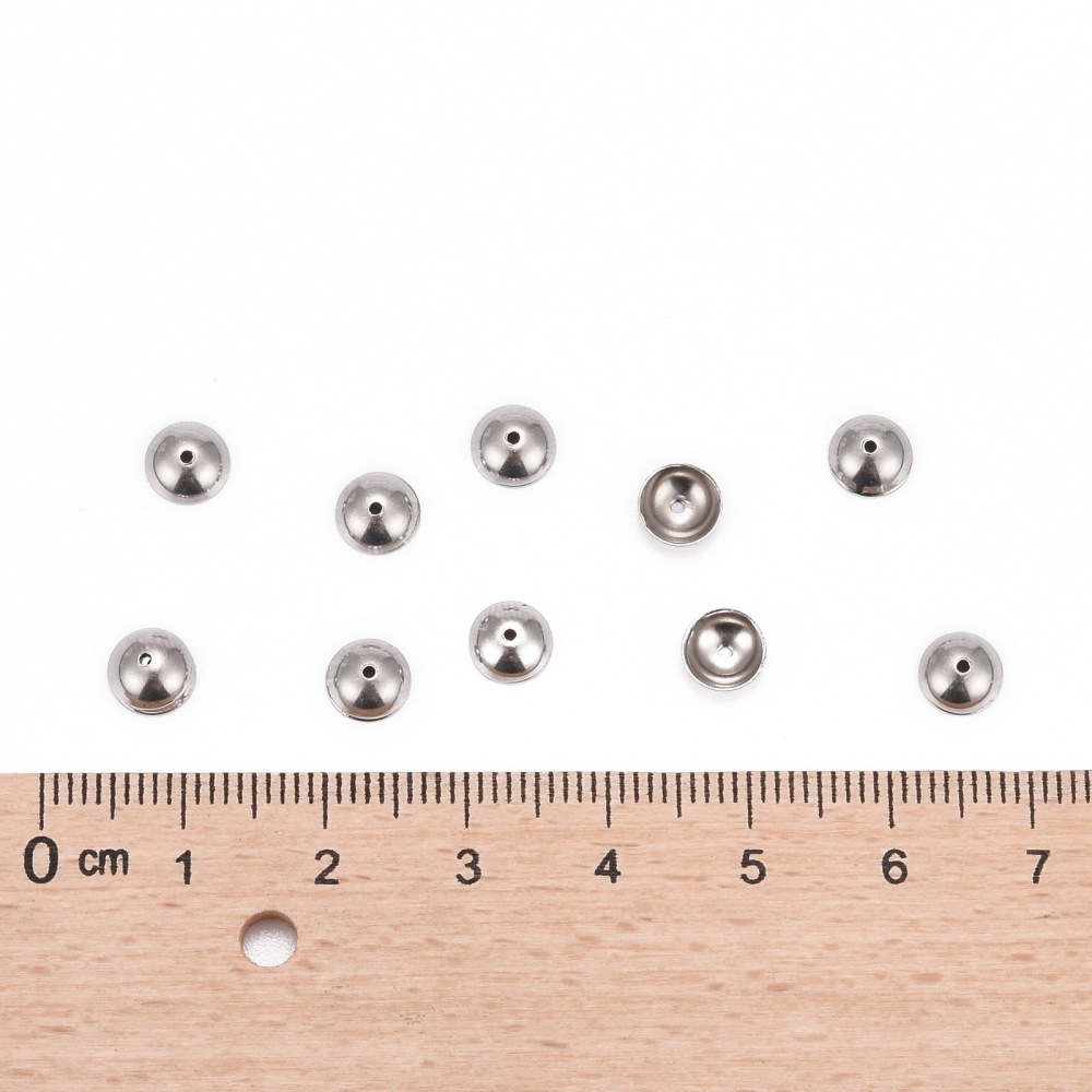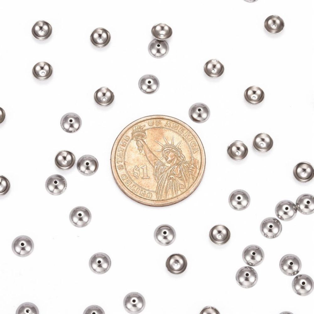 Лаконичные обниматели (шапочки, чашечки) для бусин в форме выпуклого круга, гладкие. Отлично подходят для украшений в стиле Шанель. Фурнитура для бижутерии из нержавеющей стали (марка 304: используется в пищевой промышленности, не окисляется, не темнеет, не облезает, гипоаллергенная). Оттенок может отличаться от фотографии и в разных поставках. Размер отверстий может отличаться у разных обнимателей. Цена за 50 шт.
