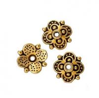 Обниматель (шапочка, чашечка) для бусин - стилизованный цветок с четырьмя лепестками. Золотистого цвета с чернением. Оттенок может отличаться от фотографии и в разных поставках. Цена за 5 грамм (около 18 штук, фасуются на вес без проверки на дефекты).