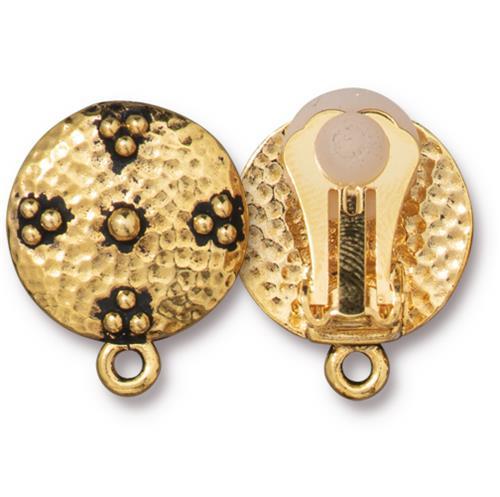 Довольно крупные основы для клипс с декоративной узорной платформой и петелькой. Дизайн OPULENCE. На застежке имеется силиконовая вставка для более комфортного ношения. Покрытие - позолота с чернением, оттенок может отличаться от фотографии и в разных поставках. Производство Тьерра Каст (Tierra Cast, США). Артикул производителя: 94-4009-26. Цена за пару.