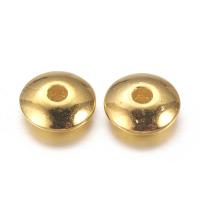 Бусина в форме слегка дутого диска (рондели) золотого цвета. Изготовлена из бижутерного сплава с золотистым покрытием. Оттенок может отличаться от фотографии. Размер отверстия около 1.3 мм. На покрытии возможны небольшие царапинки и вмятинки. Цена за 10 грамм (около 36 бусин, фасуются без проверки на брак и пересчета.).