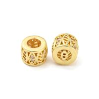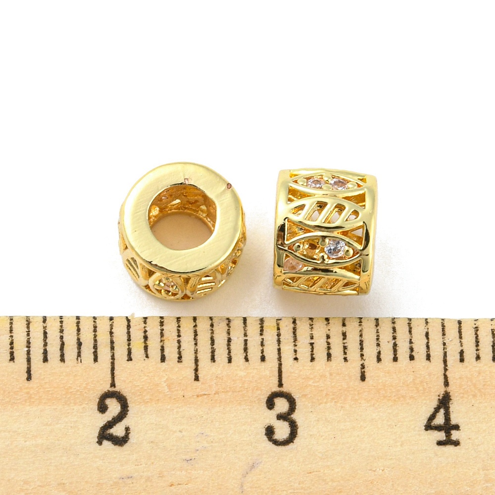 Элитная ювелирная фурнитура премиум класса - Милано люкс (Milano Lux), качественный элемент для создания бижутерии. Эффектная евро-бусина - укороченная трубочка (бочонок) с большим отверстием и резным узором в виде листиков. Эта бусина будет отлично смотреться на браслетах и колье. Подходит для браслетов в стиле Пандора (Pandora). Диаметр отверстия примерно 4 мм. Бусина декорирована кристально-прозрачными стразами - фианитами (Cubic Zirconia– кубик циркония, CZ, цирконы) в технике микроинкрустация паве. Материал - латунь, сверху покрытие золотистого цвета. Оттенок может отличаться от фотографии и в разных поставках. Цена за 1 штуку.