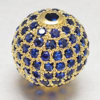 Элитная ювелирная фурнитура премиум класса - Милано люкс (Milano Lux), качественный элемент для создания бижутерии. Эффектная бусина - шарик. Эта круглая бусина будет отлично смотреться как на браслетах с натуральными камнями, так и в сережках или украшениях на шею. Диаметр отверстия примерно 1.5 мм. Бусина декорирована синими стразами - фианитами (Cubic Zirconia– кубик циркония, CZ, цирконы) в технике микроинкрустация паве. Материал - латунь, сверху покрытие золотого цвета. Оттенок может отличаться от фотографии и в разных поставках. Цена за 1 штуку.