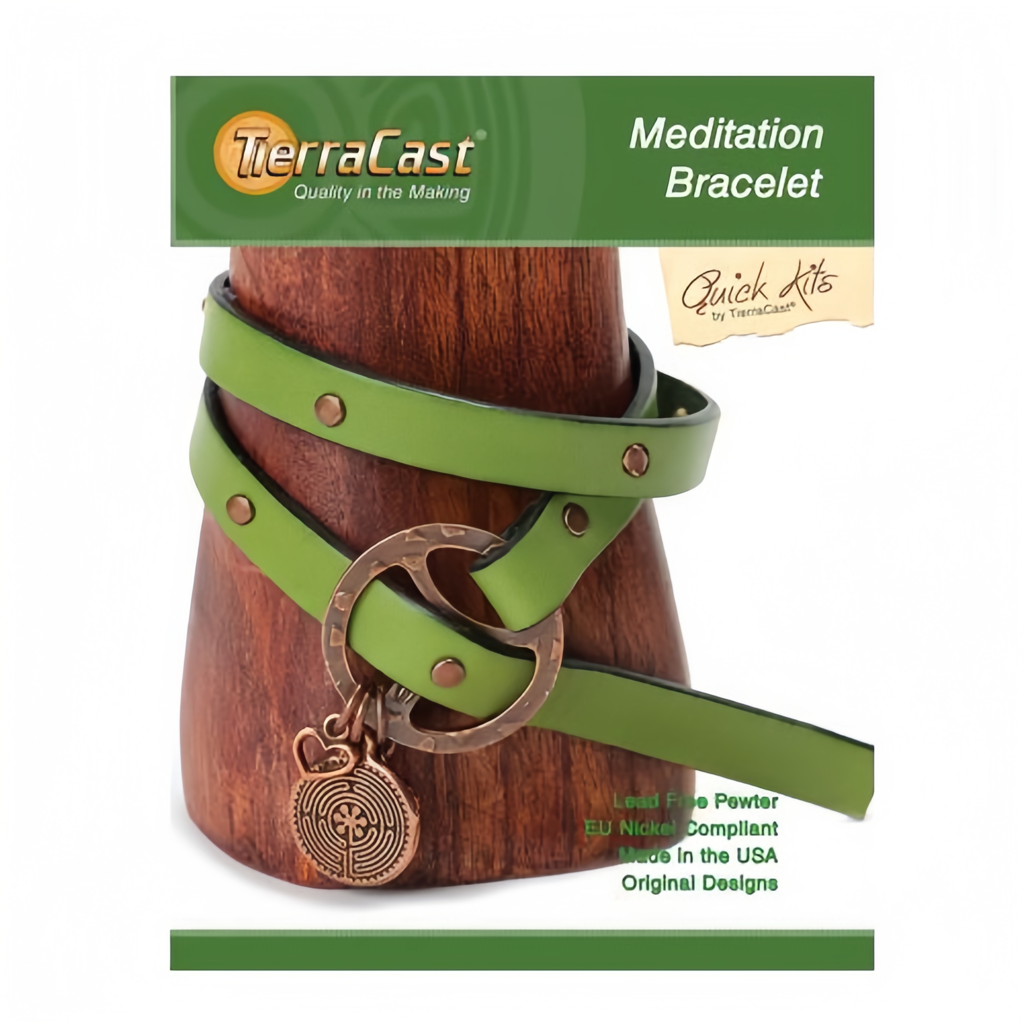 Набор для создания кожаного браслета обмотки с металлическими медными компонентами. Диаметр готового двойного браслета - от 15 до 20 см. Уровень сложности: легкий (1 из 3). Производство - американская компания TierraCast (ТьерраКаст, США). Дизайн MEDITATION (Медитация). Артикул поставщика: SP-6905-00 В набор входит инструкция на английском языке и все необходимые материалы: 1. Металлическая декоративная пряжка медного цвета - 1 шт. 2. Медная подвеска Лабиринт - 1 шт. 3. Медная подвеска Контурное сердце - 1 шт. 4. Медная подвеска Ключик - 1 шт. 5. Заклепки медного цвета 4 мм - 7 пар 6. Плоский кожаный шнур зеленого цвета - 50 см. 7. Соединительные колечки медного цвета - 3 шт. Для сборки Вам понадобятся: ножницы, дырокол для кожаного шнура, инструменты для установки заклепок, тонкогубцы, линейка, ручка (в набор не входят). Отличный подарок для начинающих мастериц. Цена за 1 набор.