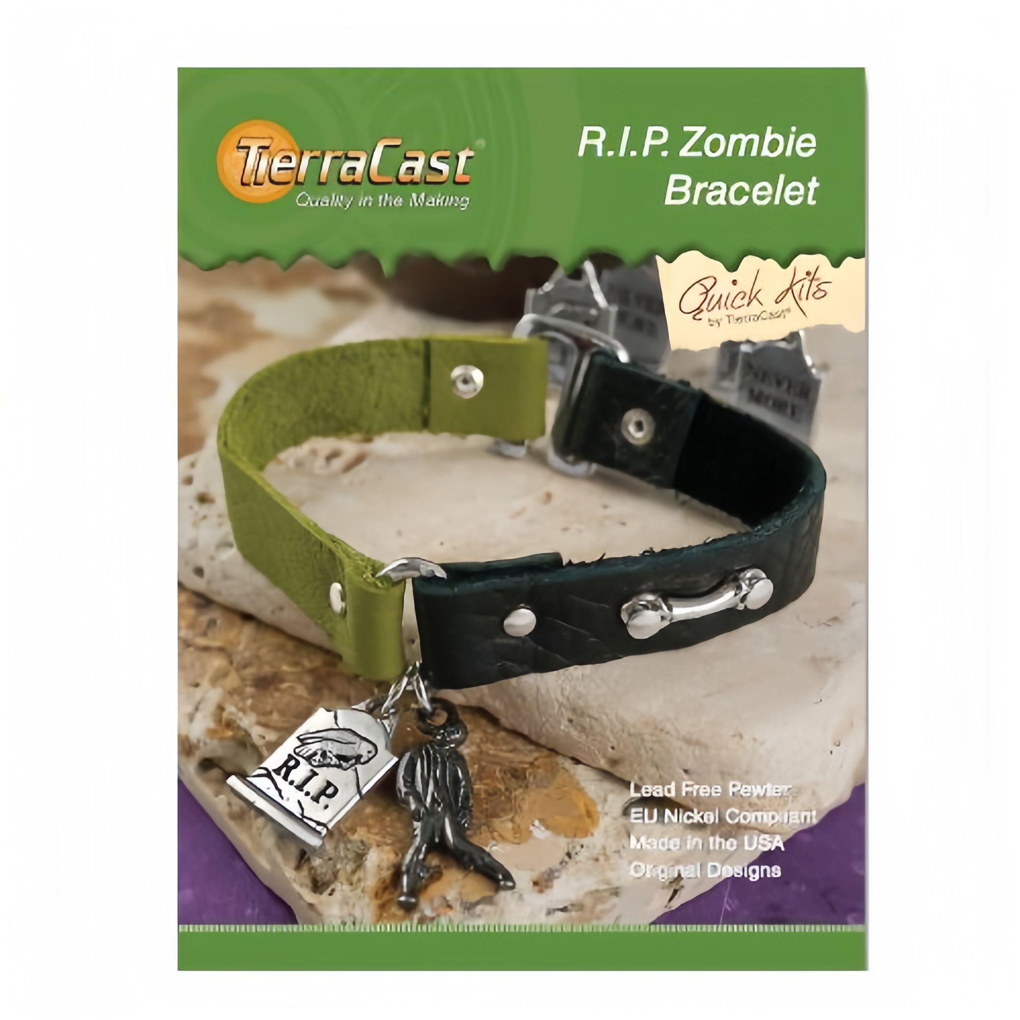 Набор для создания оригинального кожаного браслета с металлическими посеребренными компонентами. Диаметр готового браслета - 19 см. Уровень сложности: легкий (1 из 3). Производство - американская компания TierraCast (ТьерраКаст, США). Дизайн RIP ZOMBIE (Покойся с миром, Зомби!). Артикул поставщика: SP-6908-00 В набор входит инструкция на английском языке и все необходимые материалы: 1. Родированный Е-образный крючок (застежка) - 1 шт. 2. Посеребренная подвеска Могильная плита - 1 шт. 3. Посеребренная или черная (в разных наборах разные) подвеска Зомби - 1 шт. 4. Заклепки серебристого цвета - 6 пар 5. Родированный коннектор-овал - 1 шт. 6. Посеребренный коннектор Косточка - 1 шт. 7. Плоский кожаный шнур 12 мм болотно-зеленого цвета - 12.5 см. 8. Плоский кожаный шнур 12 мм черного цвета - 12.5 см. 9. Соединительные колечки, родий - 2 шт. Для сборки Вам понадобятся: ножницы, дырокол для кожаного шнура, инструменты для установки заклепок, тонкогубцы, линейка, ручка (в набор не входят). Отличный подарок для начинающих мастериц. Цена за 1 набор.
