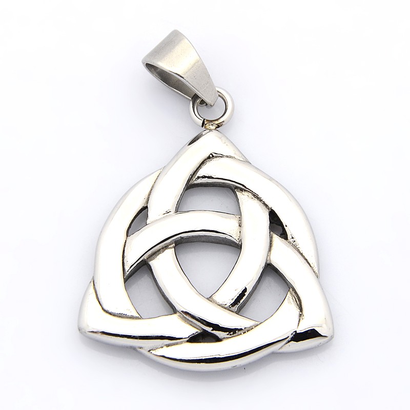 Качественная не темнеющая фурнитура из нержавейки. Крупная тяжёленькая двусторонняя подвеска - кельтский треугольный узел (трикветр, триквестр). Эта подвеска - знак сериала "Зачарованные" (трилистник или узел трех листков). Подвеска сделана из нержавеющей стали марки 304 (используется в пищевой и медицинской промышленности, не боится влаги, не окисляется, не темнеет, не облезает). Оттенок может отличаться от фотографии и в разных поставках. Размер самой подвески (без подвижной петельки) 45*39*5мм. К подвеске прикреплён разъёмный держатель (бейл) размером примерно 14*8*7мм, при желании его можно убрать. Подвеска довольно массивная, хорошо будет смотреться в качестве брелока для сумки/рюкзака. Цена за 1 шт.