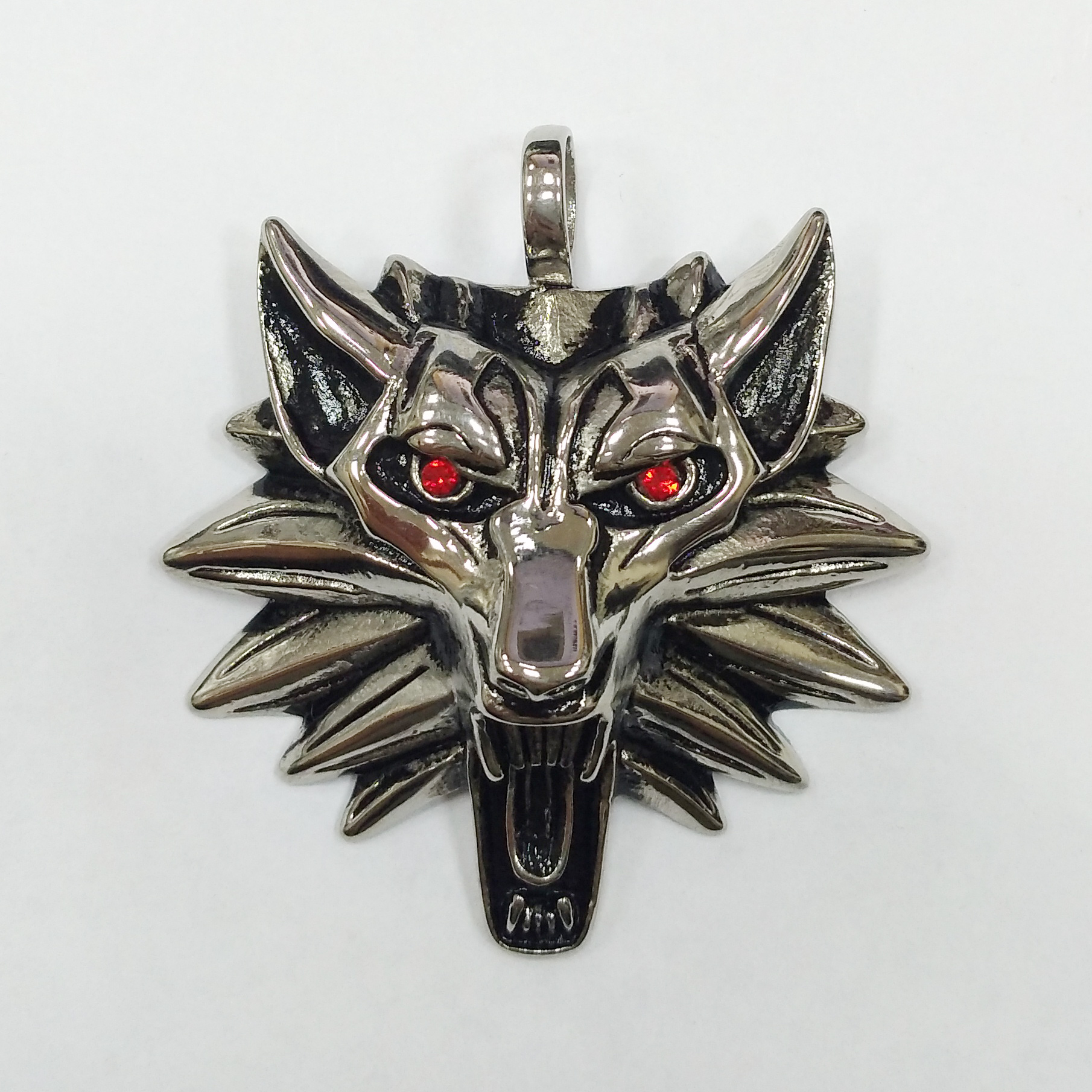 Очень эффектная крупная подвеска из нержавеющей стали - рычащий волк. Подвеска выпуклая односторонняя. В глаза вклеены стразы красного цвета. Подвеска напоминает медальон Ведьмака - амулет школы Волка. Отлично подойдет в качестве мужского кулона или брелока на сумку (рюкзак). Диаметр отверстия петельки - около 7 мм. Нержавеющая сталь марки 316 не темнеет и не облезает, гипоаллергенная (используется в пищевой и медицинской промышленности). Оттенок может отличаться от фотографии и в разных поставках. Цена за 1 шт.