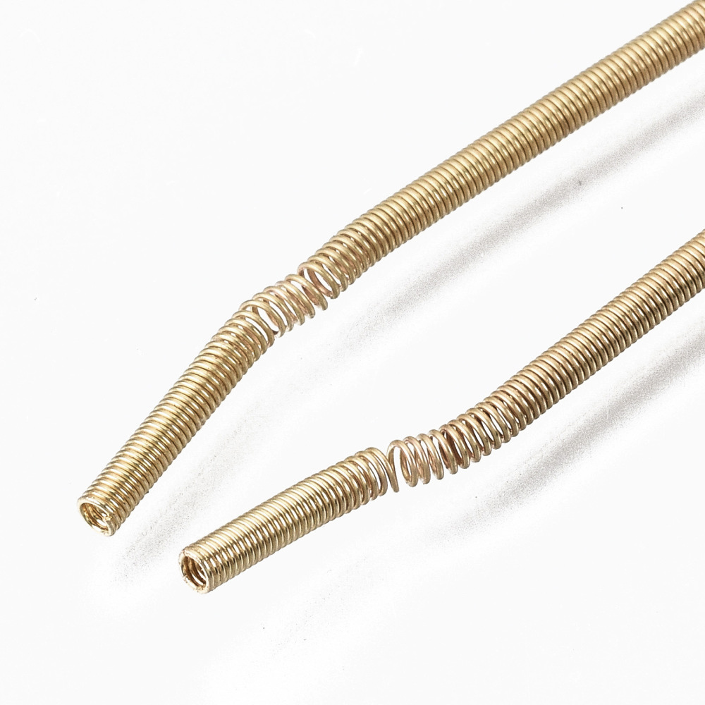 Гладкая золотистая проволока-пружинка типа бульонка - канитель. Тип: жёсткая. Базовый материал - сталь. Толщина, заявленная производителем - 2 мм, может немного отличаться в разных поставках. Длина около 95-99 см (канитель нарезана производителем). На проволоке могут периодически встречаться заломы/растянутые участки. Цвет приглушённое золото, оттенок может отличаться от фотографии и в разных поставках. Цена за 1 кусочек (95 см).