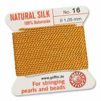 Очень толстая и прочная шелковая нить для низания бус. Изготовлена из высококачественного натурального 100% шелка, произведена немецкой компанией Griffin. К нити прикреплена стальная скрученная проволочка-иголка для нанизывания бусин. Идеально подходит для использования с жемчугом и натуральными камнями. Цвет темно-желтый (amber). Толщина около 1,05 мм. Цена за моток 2 метра.