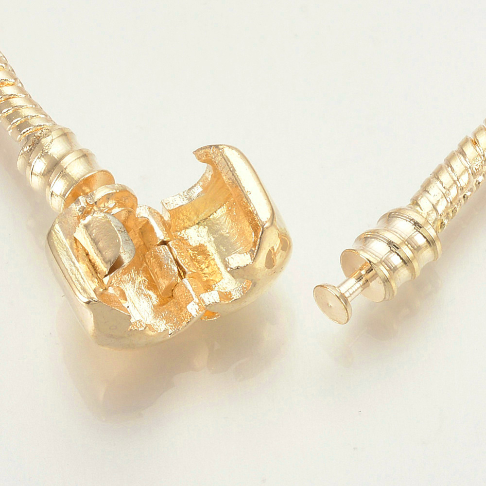 Цепочка-змейка из латуни с покрытием золотистого цвета. Эта цепочка используется как основа для браслета в стиле Пандора. Диаметр цепочки около 3 мм. На цепочке имеются припаянные бусины-фиксаторы диаметром 4.2 мм. Замочек - защелкивающаяся застежка-цилиндр, что позволяет легко менять бусины на браслете. Длина браслета примерно 18 см. Оттенок может отличаться от фотографии и в разных поставках. Цена за 1 цепочку.