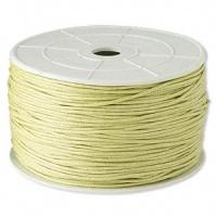 Вощеный шнур, 100% хлопок, цвет желто-зеленый. Шнур довольно рыхлый, может казаться толще заявленной производителем толщины. Толщина 0.9-1.2 мм. По возможности, продается цельным куском, однако, может поставляться несколькими отрезами. Цена за 10 метров.