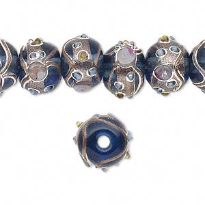 Бусина лампворк ручной работы с золотистым узором, синяя, прозрачная. Бусины могут немного отличаться по цвету и размеру, а также дизайну. Диаметр отверстия - около 1.5 мм. Цена за 5 бусин.