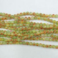 Бусины из стекла, выполнены вручную в технике миллефьори. Бусины полосатые салатово-белые с красно-желтыми цветочками. Оттенок может отличаться от фотографии и от партии к партии. Цена за низку (около 65 бусин).