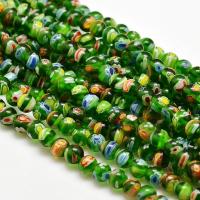 Стеклянные бусины ручной работы, выполнены в технике миллефиори. Зелёные бусинки с разноцветными узорами. Оттенок может отличаться от фотографии и в разных поставках. Цена за низку около 65 бусин (низки формируются без проверки каждой бусины на дефекты).