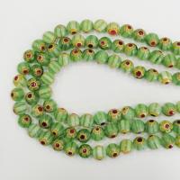 Низка стеклянных бусин ручной работы, выполненных в технике миллефиори. Полосатые светло-зеленые бусины с жёлто-бордовыми цветочками. Оттенок может отличаться от фотографии и от партии к партии. Бусины могут немного отличаться по форме и размеру. В низке около 42 бусин, низки формируются без проверки каждой бусины на дефекты. Цена за низку.